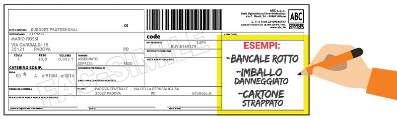 Indicando il danno per iscritto potrai controllare la merce in un secondo momento ed effettuare resi o contestazioni in caso risulti danneggiata.