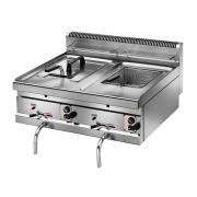 Caratteristiche principali Vasca stampata in AISI 304 - Resistenze rotanti Cestello cromato con manico in bachelite Rubinetto scarico 1” - Termostato di lavoro 190°C Termostato di sicurezza 235°C Vasca pulita con bruciatori esterni Barra porta cestino - Coperchio - Piedini regolabi..